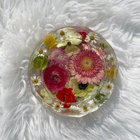 Floral blocks are hand-crafted with your preserved flowers and resin. Thickness varies from 1-3 inches thick, depending on the flowers and molds. All epoxy will eventually yellow to some degree; however, our casting resin has UV inhibitors in them that will delay the change in color. Please do NOT to display them in direct sunlight.