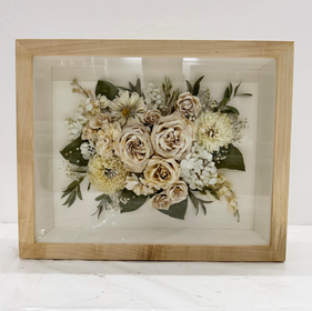 Floral Shadow Boxes are designed to be hung on walls and serve as an option to preserve flowers in a combination of 3D and pressed formats. All flowers will be sealed with a protective sealer to preserve their color, prevent discoloration over time, and protect against humidity. The sealer also gives the flowers a glossy finish, enhancing their overall look while ensuring long-term durability. Each piece comes with 95% UV acrylic for added protection. Frame options are available in wood, black, and white to best suit your style and home décor